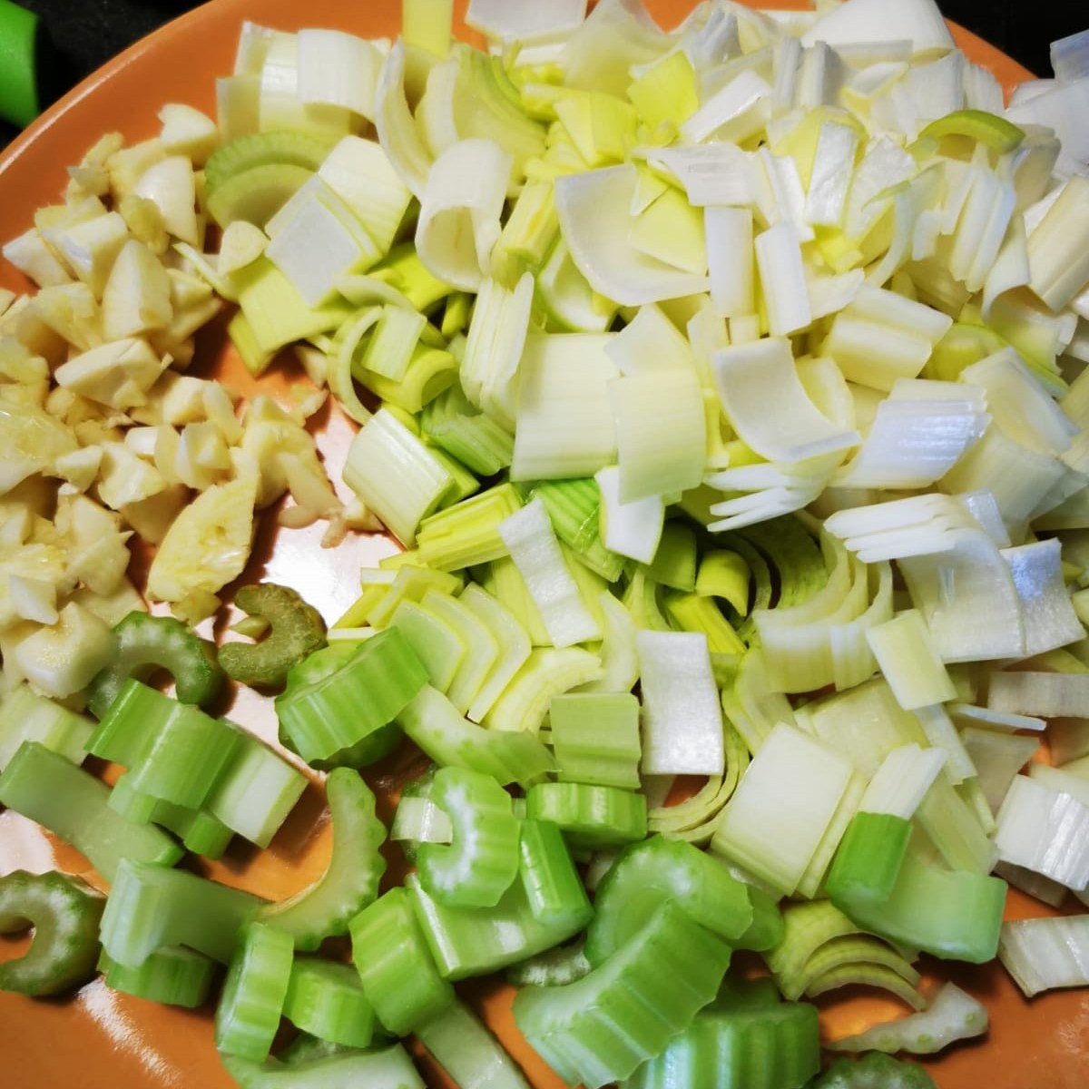 ❷ Nakrájaný nadrobno pór , pridám cesnak, zemiak + stonkovy zeler, tiež nakrájaný na drobno. Posolím a zalejem vodou tak, aby zakrylo zemiaky.