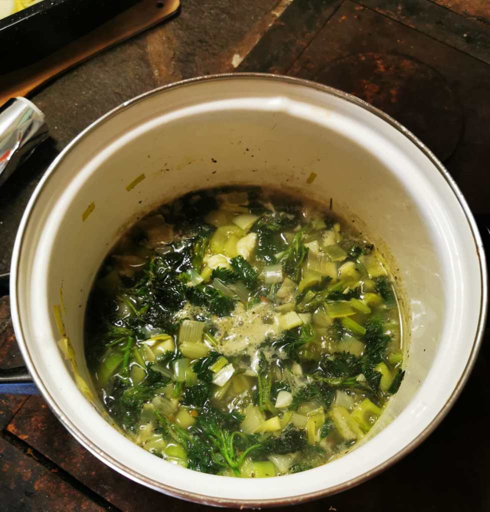 ❸ Povarím 10 minút(aby boli zemiak mäkké) , pridám umytú žihľavu, dolejem vodou, dochutím bylinkami, čiernym mletým korením.