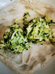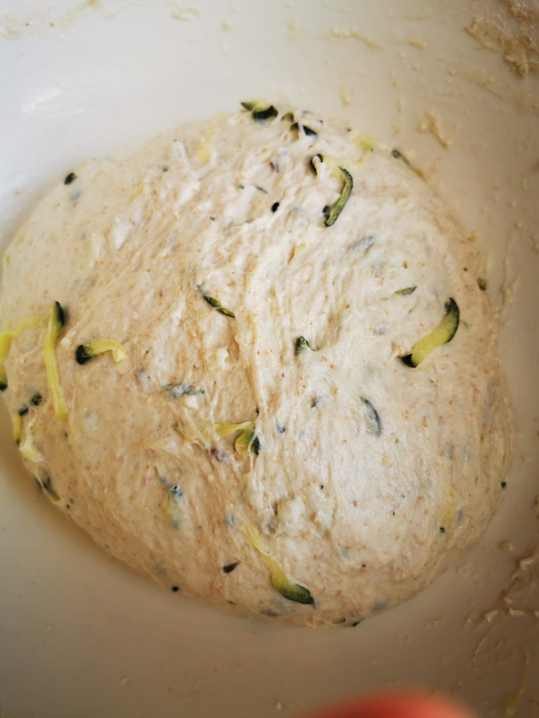 Po prebehnuti autolýzi si cesto prstami trošku porozťahujeme a cuketu dobre vyžmýkame (viď video) z tých 200g surovej cukety by vám malo ostať okolo 150-160g.