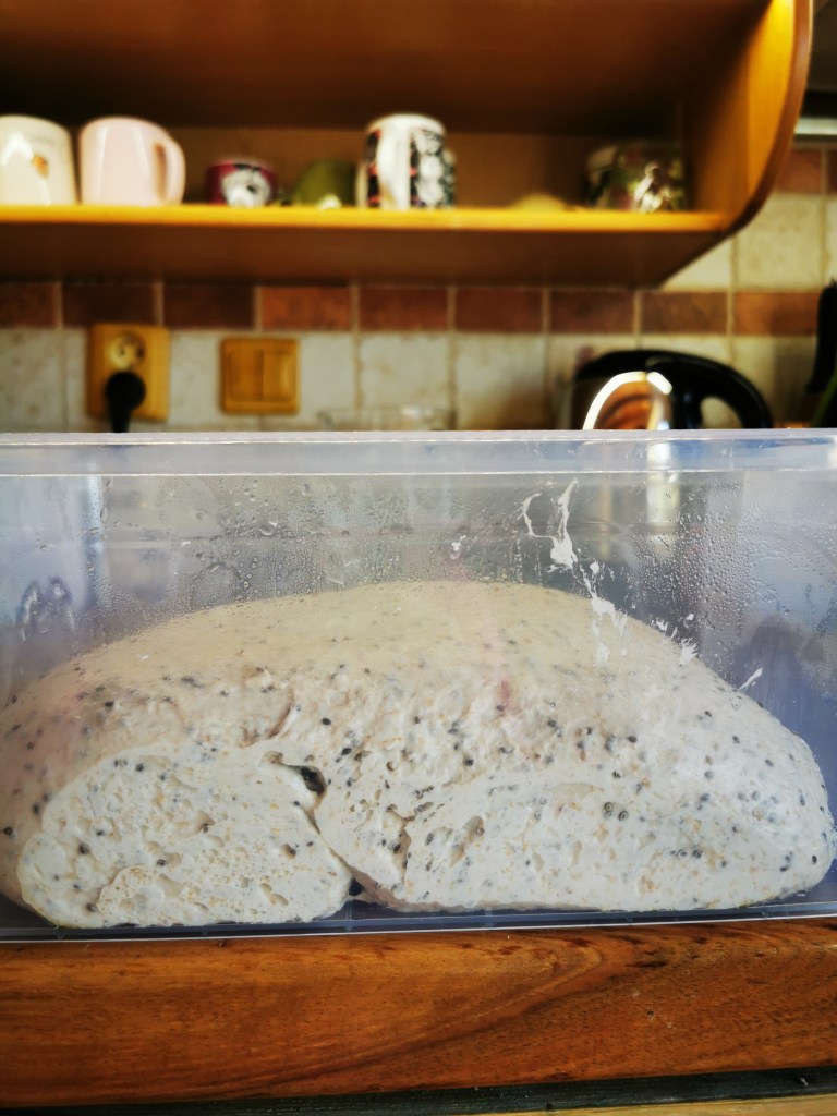 Necháme vykysnúť, mne to teraz trvalo v tomto období 8h., ale v chladnejšej miestnosti. Takže ak si poznáte svoj kvas riaďte sa svojimi časmi ak nie, tak najlepšie odsledovať. To znamená ráno urobiť rozkvas, a sledovať a keď bude raz toľko narastený tak môžete začať autolýzu.