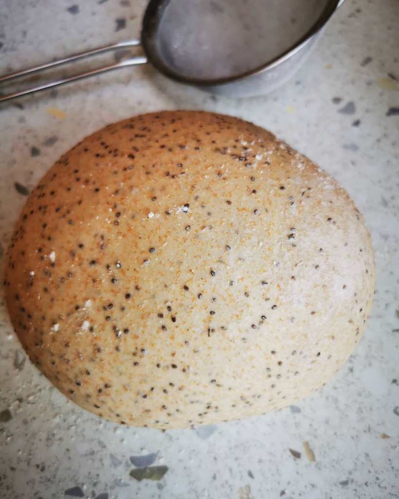 Pracovnú dosku jemne naolejujem a cesto si vyklopím na ňu. Jemnúčko utiahnem (viď video) a nechám odpočinúť 10-15min.