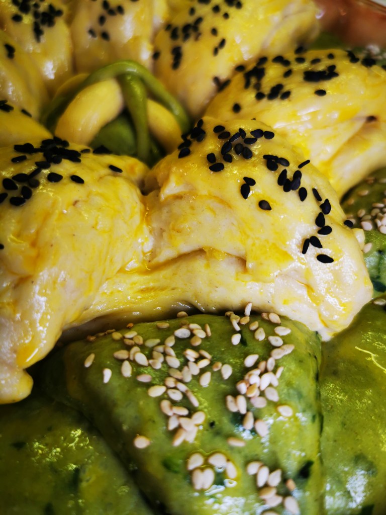 A teraz zoberieme druhú časť cesta dáme do misky pridáme nasekané bylinky plus drvenú chlorellu. Postup práce je nahratý vo videu.Pridáme po cievke olej. Vypracujeme cesto. A je hotovo.