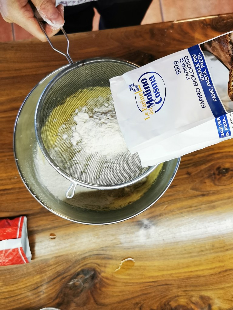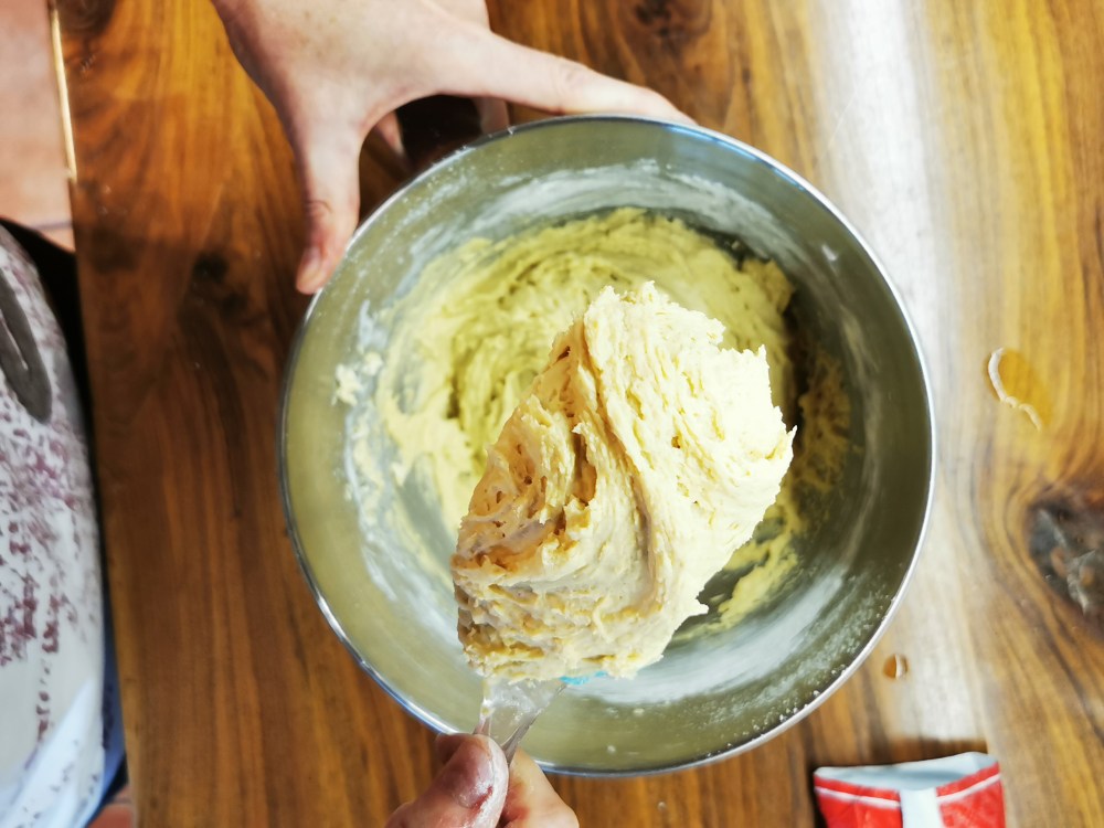 Pridáme preosiatu múku + prášok do pečiva. Vymiešame do jednej hladkej hmoty. Ak to budete robiť v robote vymeňte si metličku za lopatku..