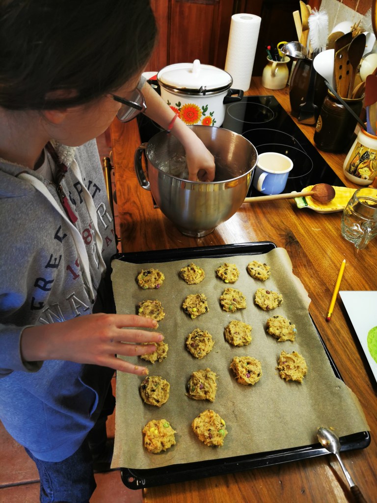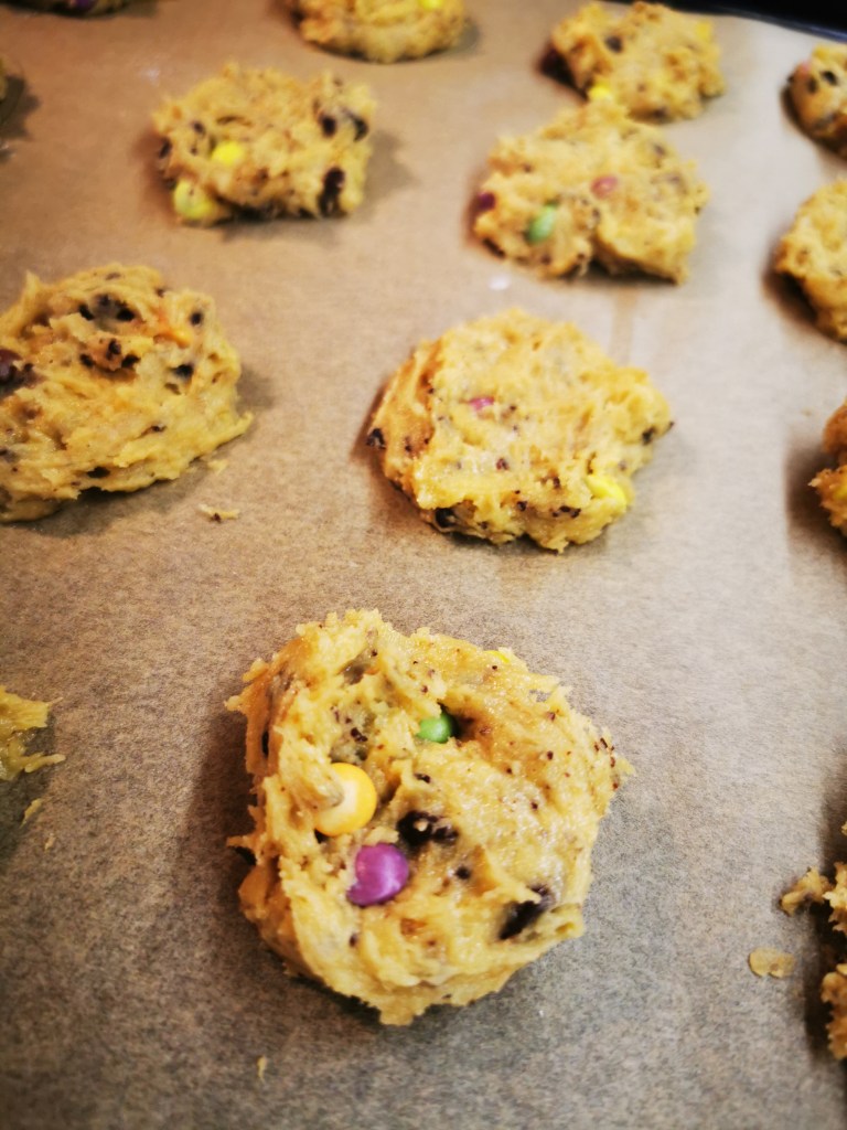 Plech vystelieme papierom na pečenie a lyžicou poukladáme kôpky cesta asi tak na priemer na 3 cm.