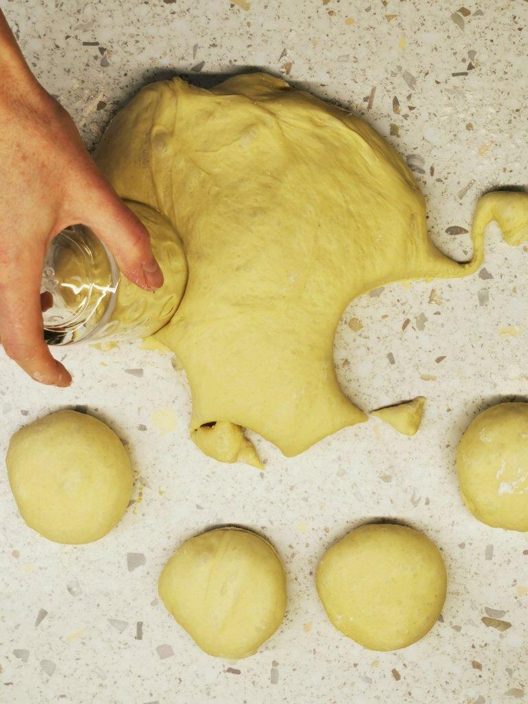 A už len povykrajovať. Po vybratí z chladničky necháme cesto aklimatizovat cca 40min. Ak kyslo von pri izbovej teplote tak rovno si ho vyklopíme na mierne pomúčenú pracovnú plochu a povykrajujeme.