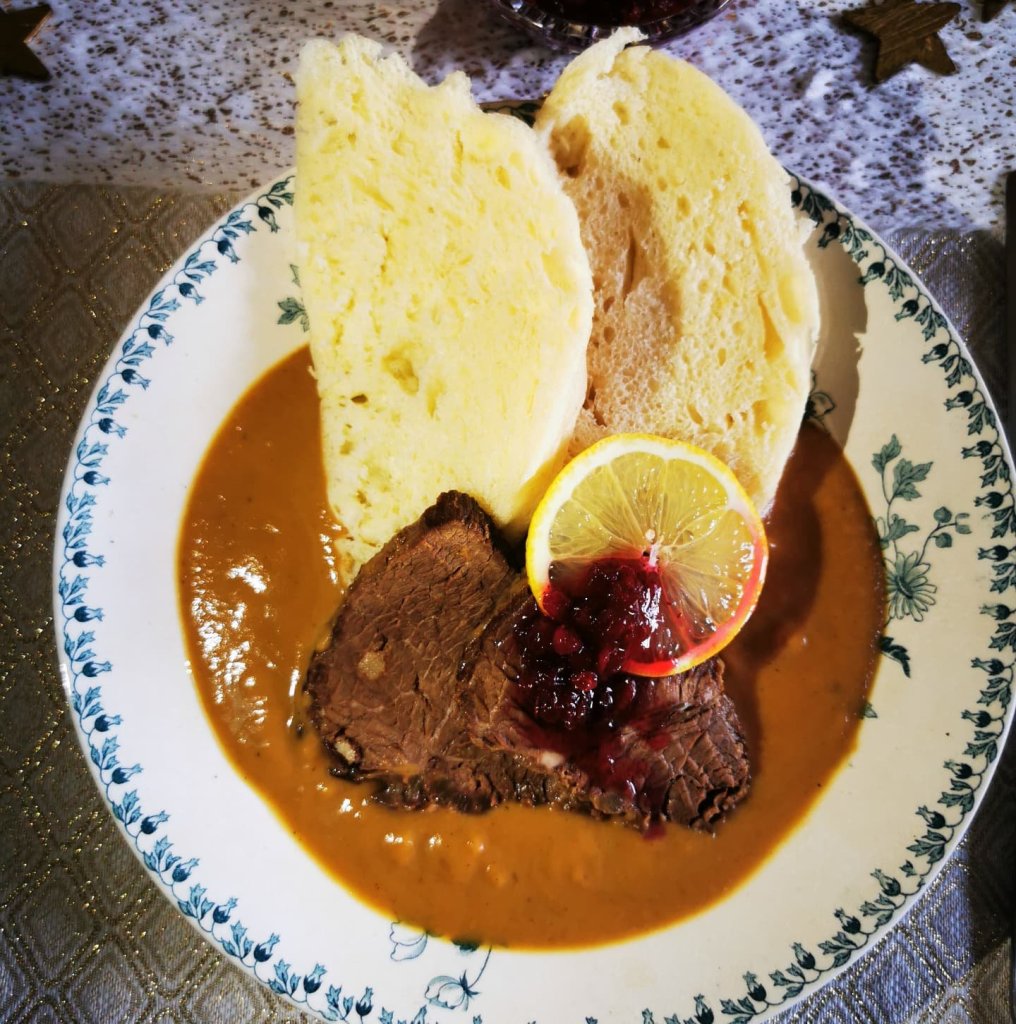 Mäso zbavíme povrazku a úhľadne nakrájame na plátky. Podávame s domácou parnou knedlikom, nákladnými brusnicami, platok citróna a trošičku vyšlahanej smotany (tie posledné 2 veci nemusíte)