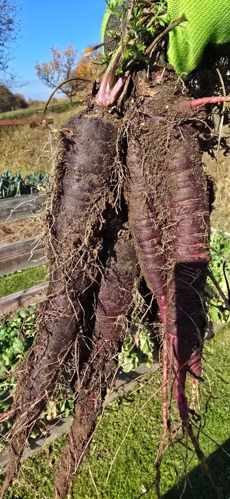 Tento je celý mrkvový v jednej polovičke je klasická oranžová mrkva A v druhej polovici cesta je fialová mrkva.